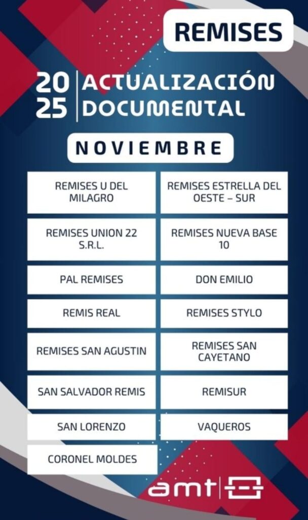 El Directorio de la Autoridad Metropolitana de Transporte de Salta, recuerda a los trabajadores del sistema impropio de transporte (taxis y remises de la Región Metropolitana) que, continua el trámite para cumplir con la Actualización Documental 2025.