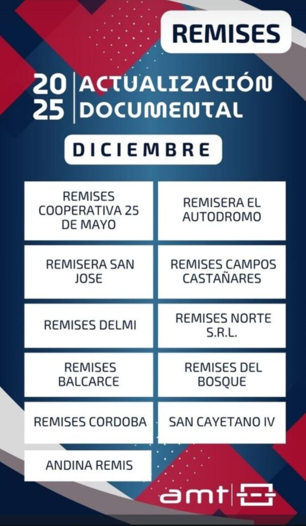 El Directorio de la Autoridad Metropolitana de Transporte de Salta, recuerda a los trabajadores del sistema impropio de transporte (taxis y remises de la Región Metropolitana) que, continua el trámite para cumplir con la Actualización Documental 2025.